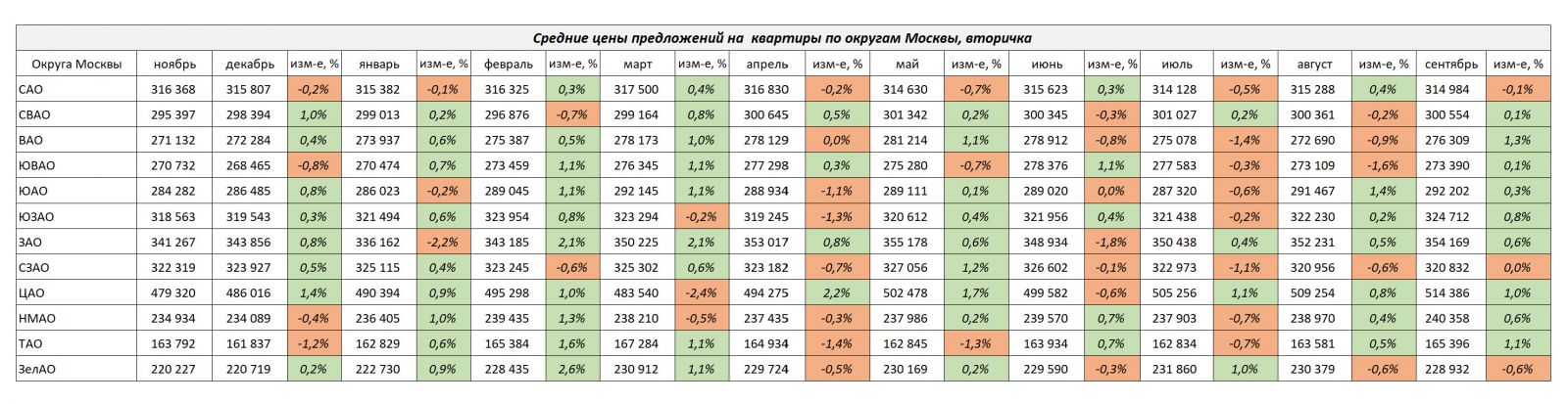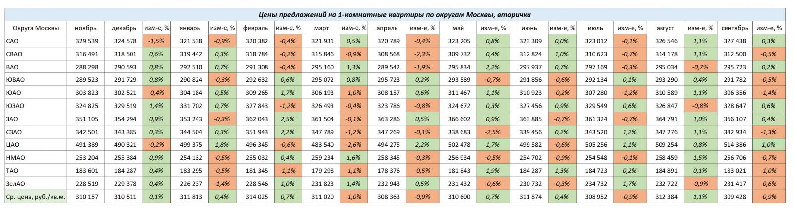 В сегменте 1-комнатных квартир в сентябре лидером роста стал ЦАО, +1,0%. Снизились цены более всего в ЮАО -1,4%.