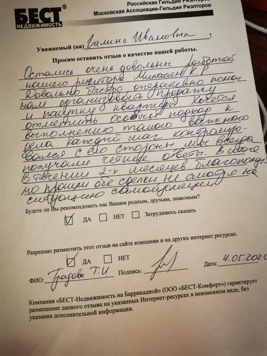 Остались очень довольны работой нашего риелтора Минасяна К.Р. из компании Бест-Недвижимость на Баррикадной. Довольно быстро, оперативно помог нам организовать продажу и покупку квартиры. Хочется отметить особый подход к выполнению такого важного дела. Каждый шаг контролировался с его стороны всегда получали четкие ответы. В итоге в течении 2х месяцев благополучно прошли обе сделки.
